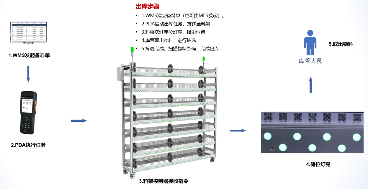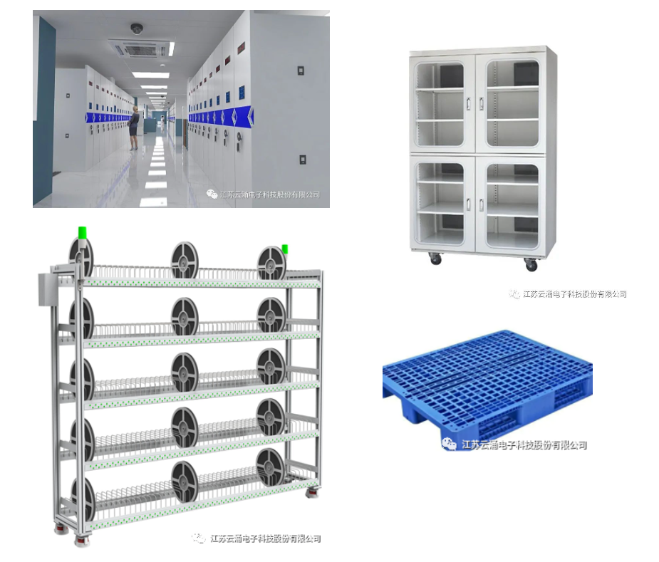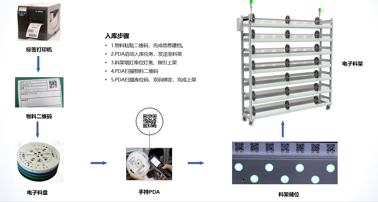 对于SMT原材料使用电子料盘为存放单元,使用智能电子料架作为存储设备。