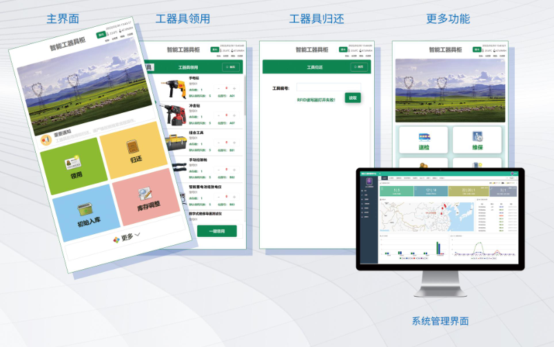 智能工器具管理系统是针对供电所普通工器具和安全类工器具管理的一整套解决方案。根据存储工具的环境要求不同,设置不同的存储柜和管理方式。系统采用RFID标签对工具进行识别和管理,通过智能工具柜的标签识别和智能控制,完成工具使用过程中的自助借还、领用引导、错误提醒以及自动盘点等功能。