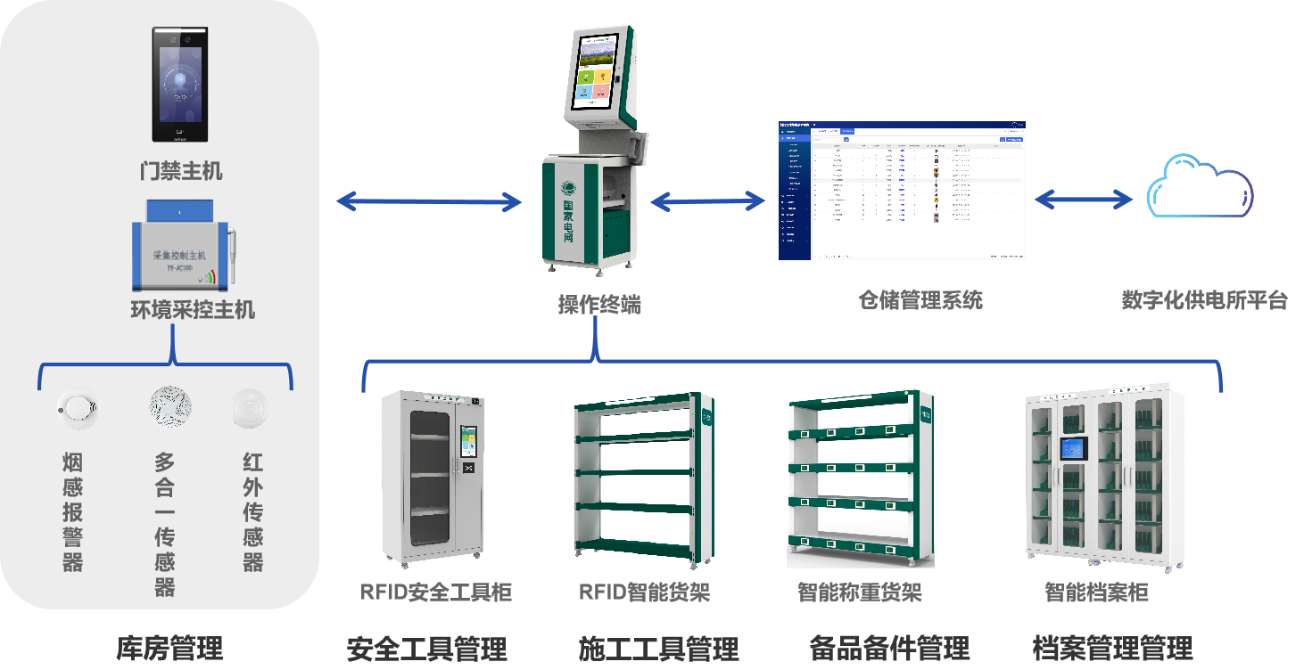 此外为了更好的实现自动控制、智能照明、安全防护以及数据分析,针对供电所“四库“的室内存储环境管理,我们配有一整套专门的库房管理系统,以及系统配套的辅助设备,比如操作终端、RFID通道门和标签等,并结合使用基于物联网、云计算等新技术构建的智能一体化管控平台,系统管理员不仅可以实现对多个库房的站点管理,还能获得更加智能化、多元化的管理解决方案。