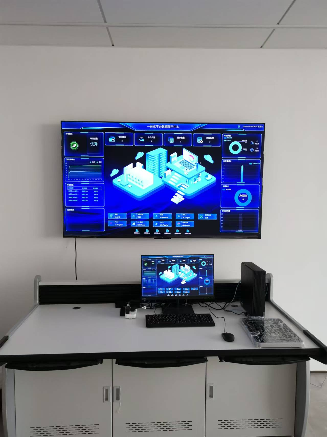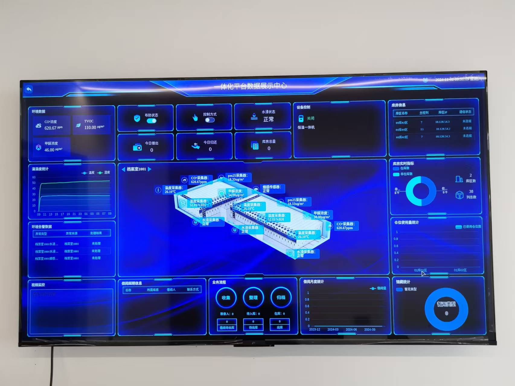 通过液晶显示大屏来展示环境数据信息、档案位置的引导信息、设备报警信息等。