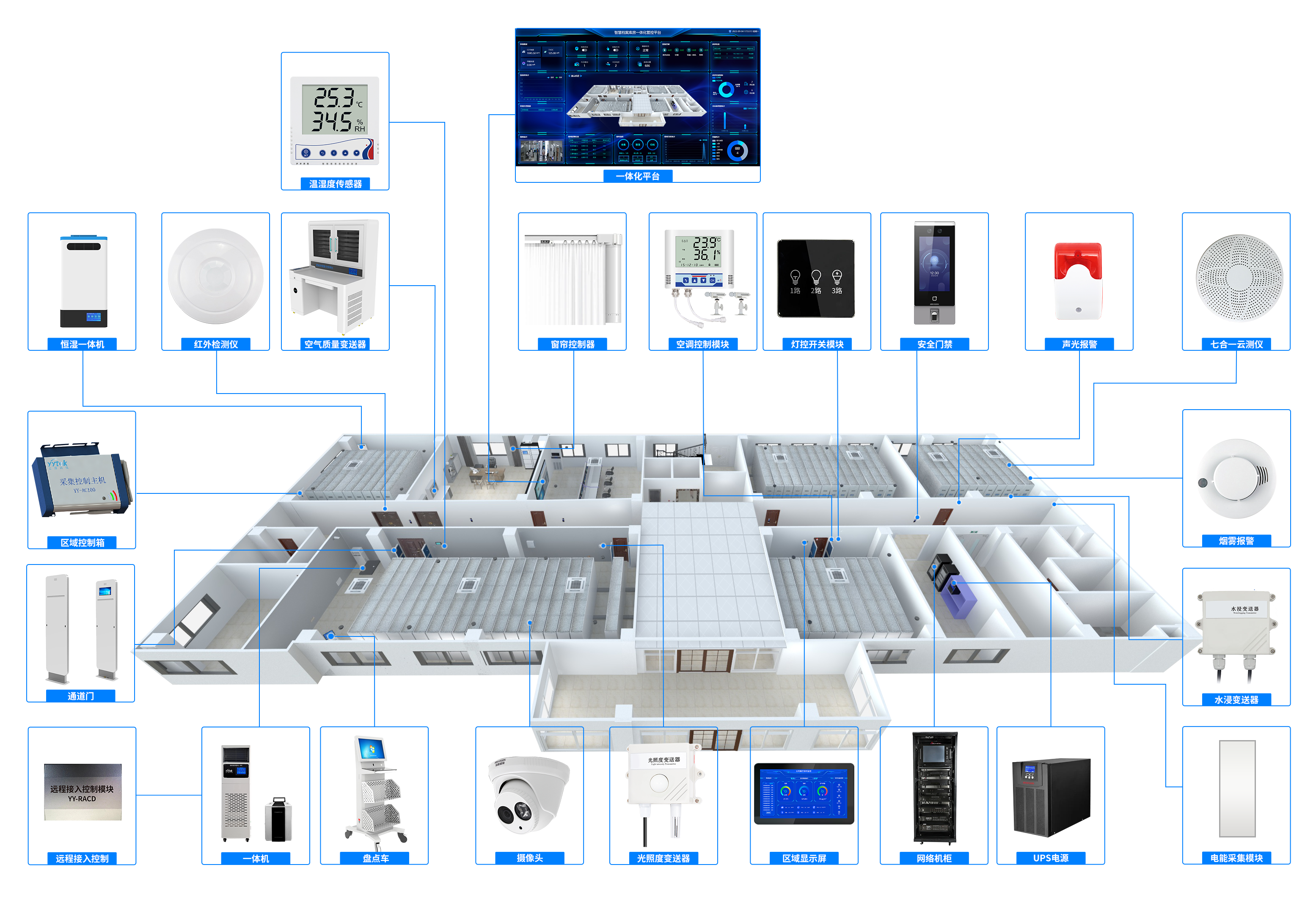 采集所有档案室内的温度、湿度、漏水、烟雾、空气质量、人员侵入等数据,并能够通过控制空调、净化一体机等设备,达到自动调节温湿度及空气净化的目的。