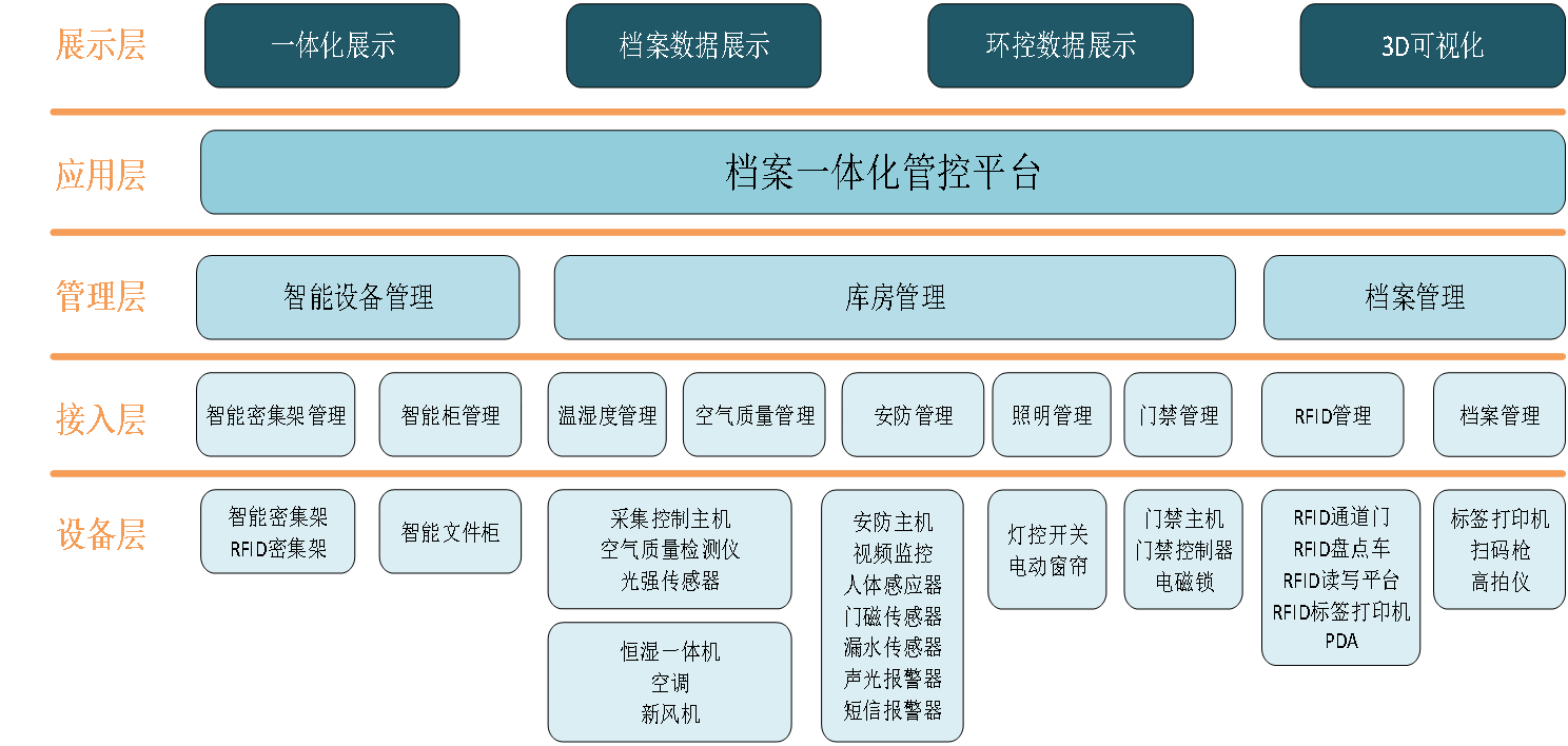 通过一套系统实现库房内实体档案管理设备、档案存储设备、档案库房环境监控设备、档案库房安全防范设备等的统一管理。