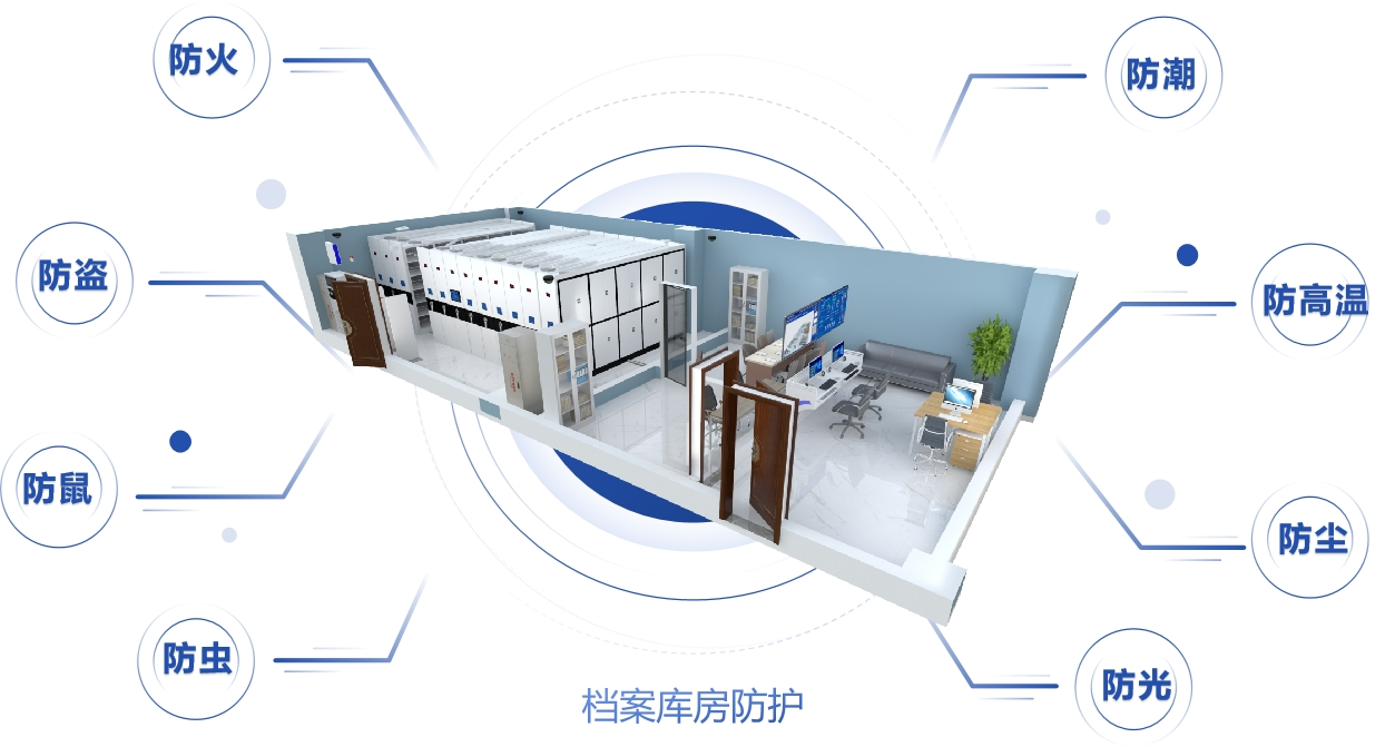 系统配置视频监控、红外探测器、门禁管理设备,通过系统统一管理调度,可与系统其他设备联动运行,保障库房安全,同时对库房内的空气质量状况进行了有效的监测、控制以及治理,自动调节、过滤、净化,时刻保证库房内空气质量的健康、稳定